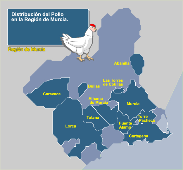 Aunque las granjas avícolas están instaladas en todos lo municipios, por volumen de producción destacan Totana (más de 6.000 Uds.), Caravaca de la Cruz (4.000 Uds.), Fuente Álamo, Murcia, Lorca y Alhama de Murcia (entre 2.000 y 3.000 Uds.), y Torre Pacheco, Las Torres de Cotillas, Cartagena y Bullas (entre 1.000 y 2.000 Uds.).